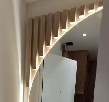 Материалы корпуса: ЛДСП 16 мм и 25 мм 2800*2070 мм Дуб Кендал натуральный H3170 ST12<br /> <br /> Подсветка в теплых тонах с выключателем.<br /> <br /> Подвесная тумба с направляющими полного выдвижения.